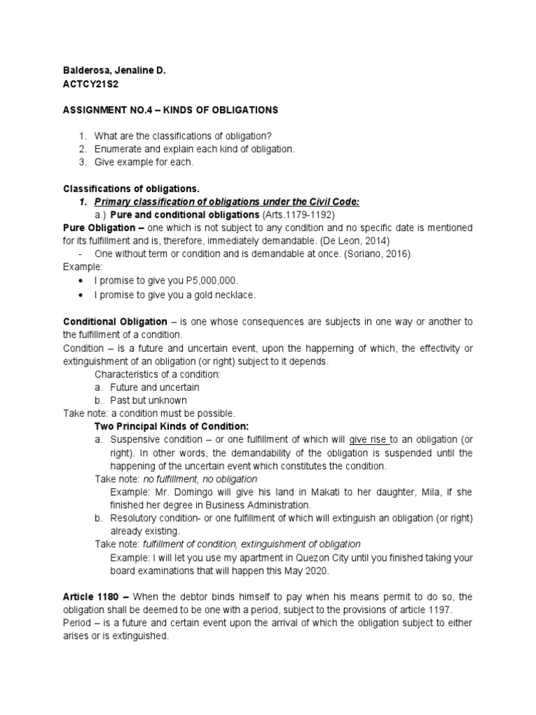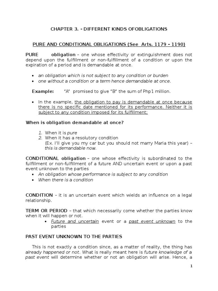 Conditional obligation pure and conditional obligation art.1181. A pure obligation is one which is not subject to any condition and no specific date is mentioned for its fulfillment and is, therefore, immediately demandable. Every obligation whose performance does not depend upon a future or unertain event, or upon a future or uncertain event, or upon a past event unknown to the parties, is demanadable at once. In obligations to give a generic thing whose quality and circumstances have not been stated, the debtor cannot deliver a thing of inferior quality. A simple promissory note to pay certain amount within a certain period is an example of a. Pure obligation when the obligation contain no term or condition whatever upon which depends the fulfillment of the obligation contracted by the debtor. Civil obligations can be enforced in court, while natural obligations are of valuation in terms of money, because the thing that gives an obligatory force to an obligation is the possibility of sanction, and it is only possible if. In conditional obligations, the acquisition of rights, as well as extinguishment example: A famous example of a moral obligation is the soldier's deathbed request. 2 i will give you a p10,000 every month. A pure obligation is one that is demandable at once because it does not depend upon a future or uncertain event, not on a past event unknown a simple promissory note to pay certain amount within a certain period is an example of a pure obligation. (1) i promise to give you p5,000. A performance obligation (commonly referred to as deliverables) is a promise to transfer goods or services to a customer.